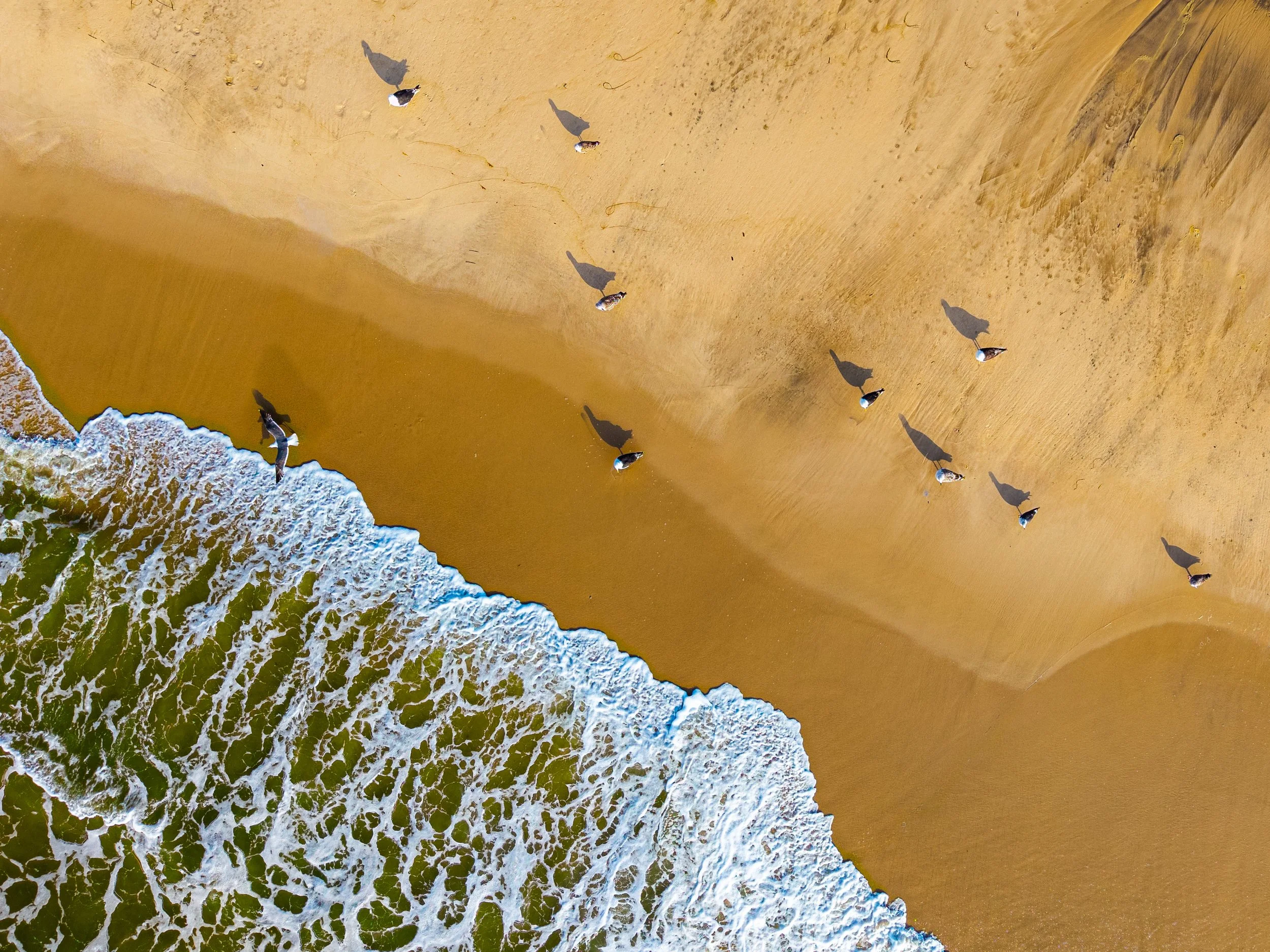 Aerial drone photography of a group of seagulls standing at the shoreline of Mecox Beach, Bridgehampton, NY USA 2025. Gull Group Contact Me