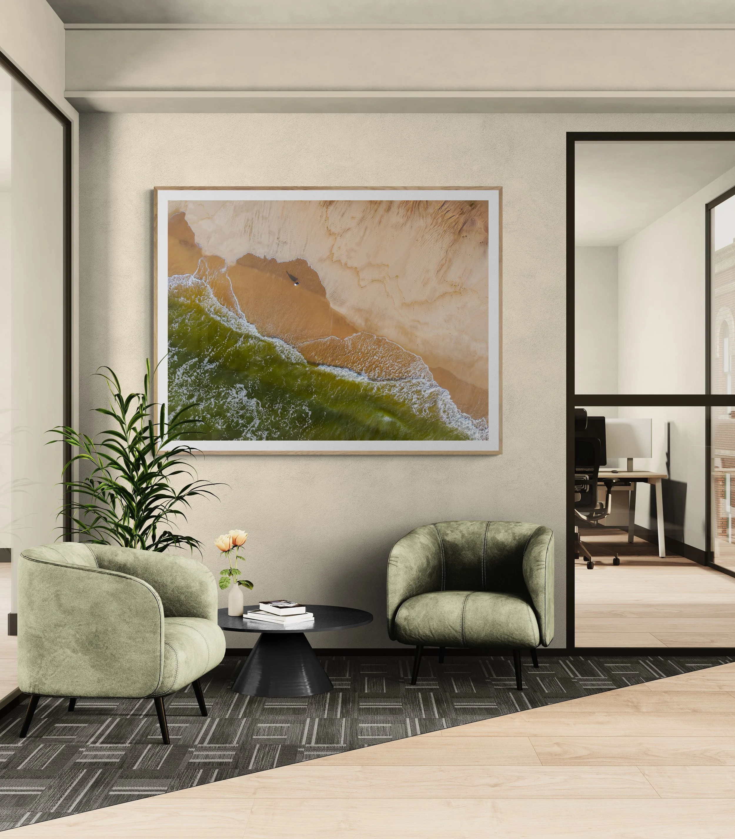 Aerial drone photography of a solo seagull standing amidst the crashing waves at Mecox Beach, Bridgehampton, NY USA 2025. Solo Seagull Contact Me